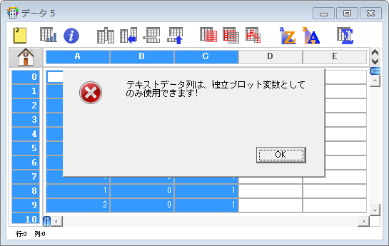 Q. Excel から読み込んだデータでグラフを作成すると「テキストデータ列は、独立プロット変数としてのみ使用できます!」というメッセージがでてグラフ作成できません。