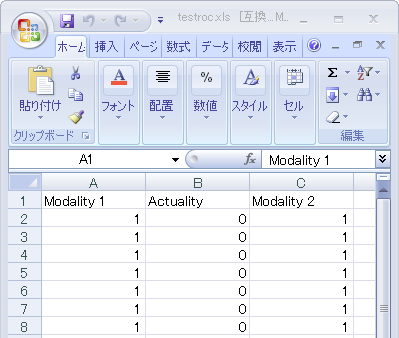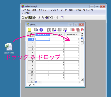 .xls 形式の Excel ファイルの場合、Windows 版ではカレイダグラフのウィンドウ内にファイルをドラッグ&ドロップ、Mac OS X 版ではファイル メニュー → 開く を実行して開くことで、タイトルを含む数値データがテキストにならずに読み込み可能ですのでご確認下さい。