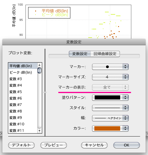 Q. カレイダグラフで「散布図」を作成した後、「プロット」メニュー → 「変数設定」を実行したときに、変数設定パネルの「マーカーの表示」がアクティブになりません。