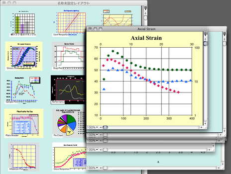 「KaleidaGraphレイアウト」で保存した場合は、プロットファイルは格納されません。これを開くと空のポジションのみが表示されます。グラフを追加するには、配置したすべてのプロットを開く必要があります。