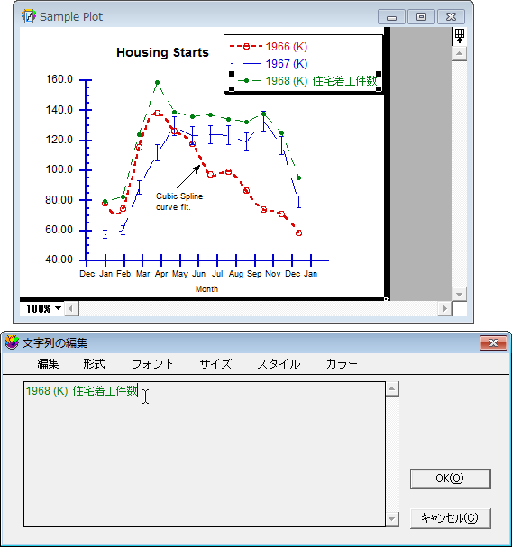 - 文字列の編集ウィンドウが表示されますので、ここでテキスト編集し「OK」ボタンをクリックすると、凡例に反映されます。