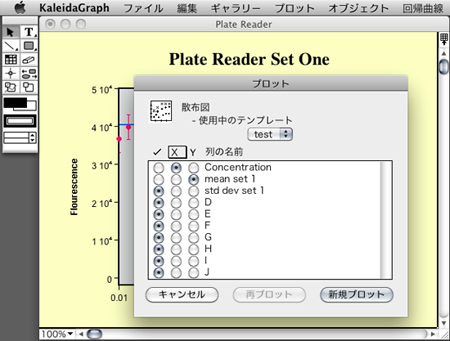 例題のプロットウィンドウ [Plate Reader] を選択して下さい。ここで選択したプロットのスタイルがテンプレートとして適用されます。