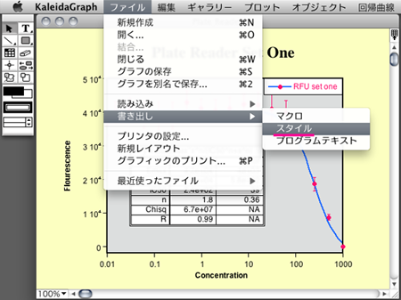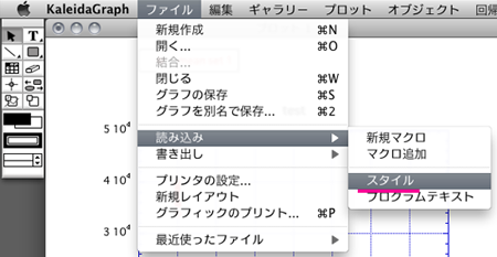 - オリジナルのグラフを表示した状態で、[ファイル] メニュー→ [書き出し] → [スタイル] を実行し、任意の場所にスタイルファイルを書き出して準備しておきます。