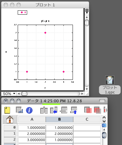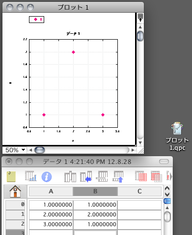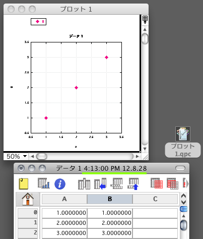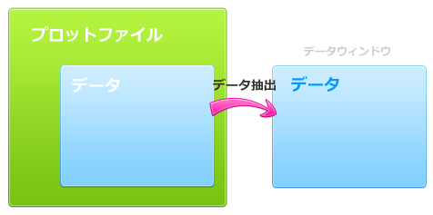 - カレイダグラフのプロットファイル (*.QPC) には、プロットを作成したデータが格納されており、プロット→データ抽出 を行うことにより、作成したデータウィンドウが表示されます。