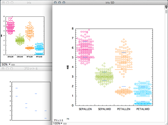 グラフの大きさや位置を調整して、ふたつのプロットを重ね合わせます。