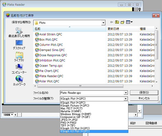 v4.5 では「ファイルの種類」メニューから、KGraph 3.5/4.0 Plot を指定して保存することができるため、この方法で v4.0 からでも読み込むことができます。※ v4.0 で読み込んでも、v4.5 の新機能に関する編集は行うことはできません。