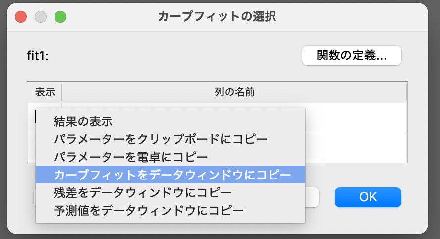 3. 「▼」のボタンを選択して「カーブフィットをデータウィンドウにコピー」を実行します。