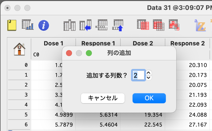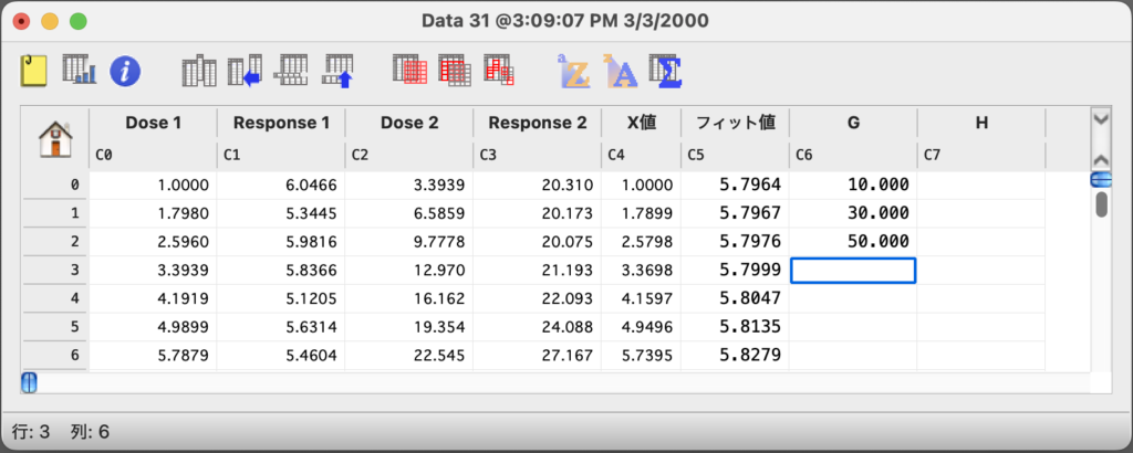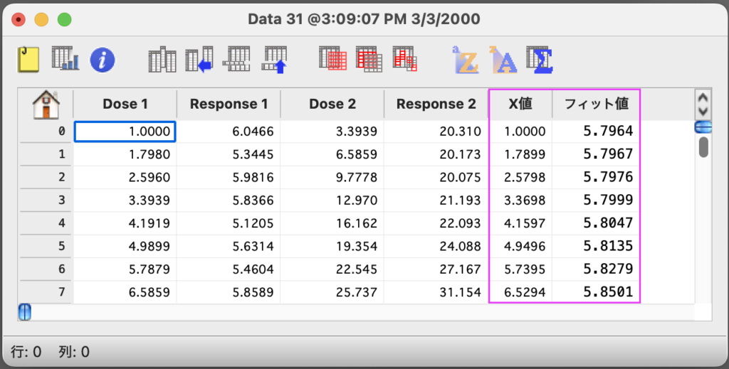 プロットメニュー → データ抽出 を実行して、データシートを表示すると右側の列に「X値」と「フィット値」の列が新たに追加されています。