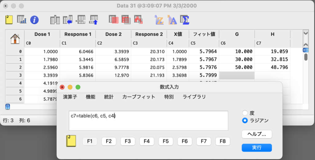 ※ ガウス分布のようにひとつの Y値に複数の X値がある場合は、「フィット値」「X値」のデータ列に対し、左右のデータに分け、左右それぞれにマスク処理してそれぞれに table コマンドで計算する必要があります。