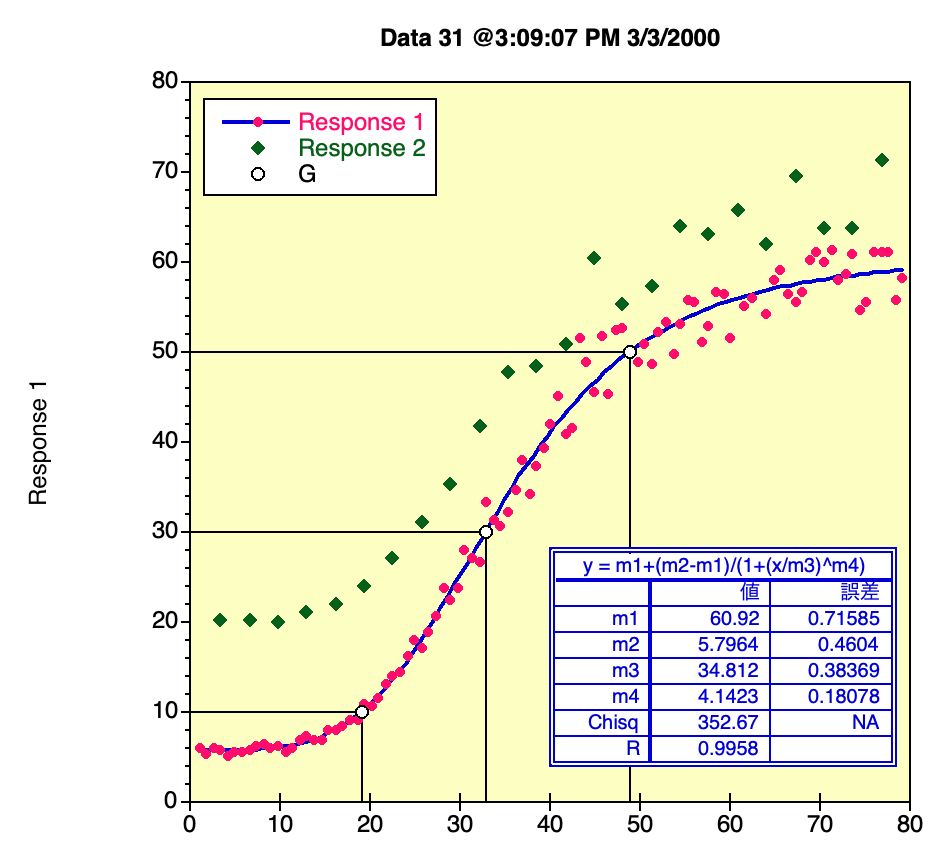 サンプルファイル (Dose Response) から Y=10, 30, 50 のときの各 X 値を求めます。