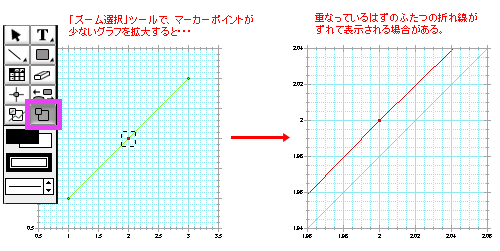 複数の折れ線グラフを重ねて表示している場合には、「ズーム選択」ツールを使用したりグラフを拡大表示する際は、マーカーポイントを多くとって調整するか、プロットデータを画像データに保存してから、そのデータを拡大するようにして下さい。 <再現方法>次のような 2つのポイントと 3つのポイントを持つデータでふたつの折れ線グラフを重複した形で作成します。 ![]() 「B」はマーカーが「●」で 3つ、「D」は両端にマーカーが「X」で2つです。 ![]() 中央の「B」単独データのマーカー「●」を小さめの範囲で選択します。 ※これには「D」のマーカー「X」が含まれていません。 ![]() プロット画面上にマーカーが1つになった時に位置情報が不確定となり、重なっているはずのふたつの折れ線がずれて表示されてしまいます。 ![]() 次に「D」を「B」と同様のデータにします。 ![]() 同じように中央のマーカーを選択します。 ※「D」のマーカー「X」も含まれます。 ![]() 問題は生じません。 ![]() このように、複数のグラフを重ねて表示している折れ線グラフに、「ズーム選択」ツールやグラフを拡大表示を行うには、画面上でマーカーポイント数やバランスに留意してご使用下さい。または、プロットデータを画像データに保存してから、そのデータを拡大するようにして下さい。 |