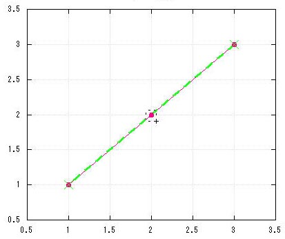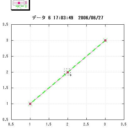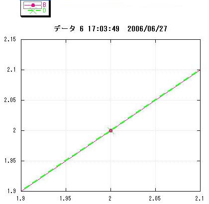 複数の折れ線グラフを重ねて表示している場合には、「ズーム選択」ツールを使用したりグラフを拡大表示する際は、マーカーポイントを多くとって調整するか、プロットデータを画像データに保存してから、そのデータを拡大するようにして下さい。 <再現方法>次のような 2つのポイントと 3つのポイントを持つデータでふたつの折れ線グラフを重複した形で作成します。 ![]() 「B」はマーカーが「●」で 3つ、「D」は両端にマーカーが「X」で2つです。 ![]() 中央の「B」単独データのマーカー「●」を小さめの範囲で選択します。 ※これには「D」のマーカー「X」が含まれていません。 ![]() プロット画面上にマーカーが1つになった時に位置情報が不確定となり、重なっているはずのふたつの折れ線がずれて表示されてしまいます。 ![]() 次に「D」を「B」と同様のデータにします。 ![]() 同じように中央のマーカーを選択します。 ※「D」のマーカー「X」も含まれます。 ![]() 問題は生じません。 ![]() このように、複数のグラフを重ねて表示している折れ線グラフに、「ズーム選択」ツールやグラフを拡大表示を行うには、画面上でマーカーポイント数やバランスに留意してご使用下さい。または、プロットデータを画像データに保存してから、そのデータを拡大するようにして下さい。 |