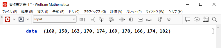 Mathematica を起動し、新規ノートブックを開いて次のようにデータを入力します。波括弧 { } は、データのリストや範囲の定義に使用します。