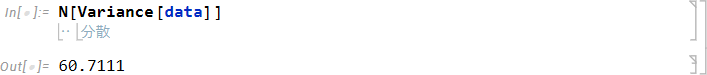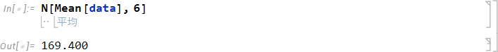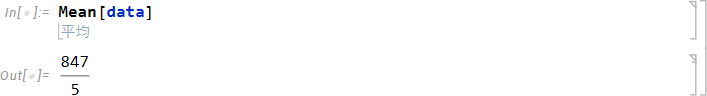平均値を求めるには、Mean 関数を使用します。Mean 関数の角括弧内に上記で割り当てた変数 data を入力して実行します。