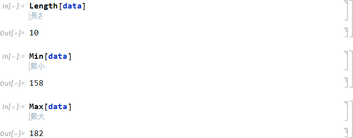 データの個数を求めるには Length 関数、最小値を求めるには Min 関数、最大値を求めるには Max 関数を使用します。