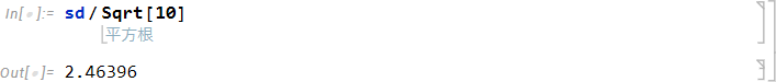 標準偏差を標本数 10 の平方根で除算します。平方根を求める Sqrt 関数と上記の標準偏差で割り当てた変数 sd を使用して次の式で計算します。