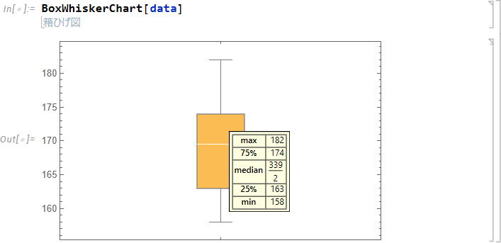 結果は次のとおりです。箱ひげ図をカーソルで選択すると最小値 (min)、第1四分位点 (25%)、中央値 (median)、第3四分位点 (75%)、最大値 (max) の情報が得られます。
