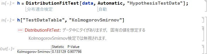| ※ データに同値があると警告「DistributionFitTest: データ中にタイがありますが、固有の値を想定する KolmogorovSmirnov 検定では無視されます.」が表示されます。 |