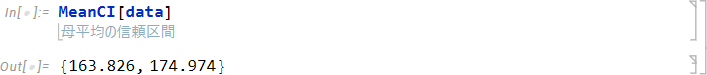 平均値の信頼区間は、MeanCI 関数を使用します。MeanCI 関数は、仮説検定パッケージ (HypothesisTesting) に含まれるため、はじめに仮説検定パッケージをロードします。パッケージの読み込みには Needs 関数を使用します。