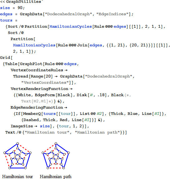 1857年にウィリアム・ローワン・ハミルトンは Icosian Game を創りました [1]。12 面体のグラフに基づく世界で、旅人は同じ都市を訪れることなく、20 の都市を訪問しなければならないというものです。ツアー (旅人の経路) がグラフの全ての頂点でループを作るとき、それは Hamiltonian tour (もしくは cycle) と呼ばれます。ツアーの最初と最後の頂点がつながれないとき、それは Hamiltonian path (もしくは trail) と呼ばれます。一つ目の図は Hamiltonian tour、二つ目は Hamiltonian path を示しています。