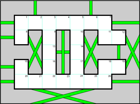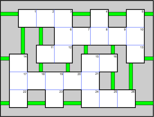 もっと簡単に解ける 26-fullerene グラフは次で与えられます [3]。頂点は正方形に置き換えられ、辺は隣接する正方形の間の辺か、四角形をつなぐ緑の線に置き換えられます。図の端の辺は、反対側の端の辺とつながっています。パズルを試すためには、A と Z を任意の2つの正方形に書いてください。それから A から Z の文字を使って、A と Z を繋ぐ Hamiltonian Path を探してください。どこに A と Z を配置したとしても、パズルを解くことができます。例えば、あなたがブロック 2 に A、ブロック 6 に Z を配置して始めると、2つの解答のうちの1つは、(A) → 2 → 3 → 4 → 8 → 7 → 15 → 16 → 9 → 10 → 5 → 1 → 14 → 13 → 26 → 25 → 24 → 21 → 20 → 19 → 23 → 22 → 17 → 18 → 11 → 12 → 6 → (Z) です。