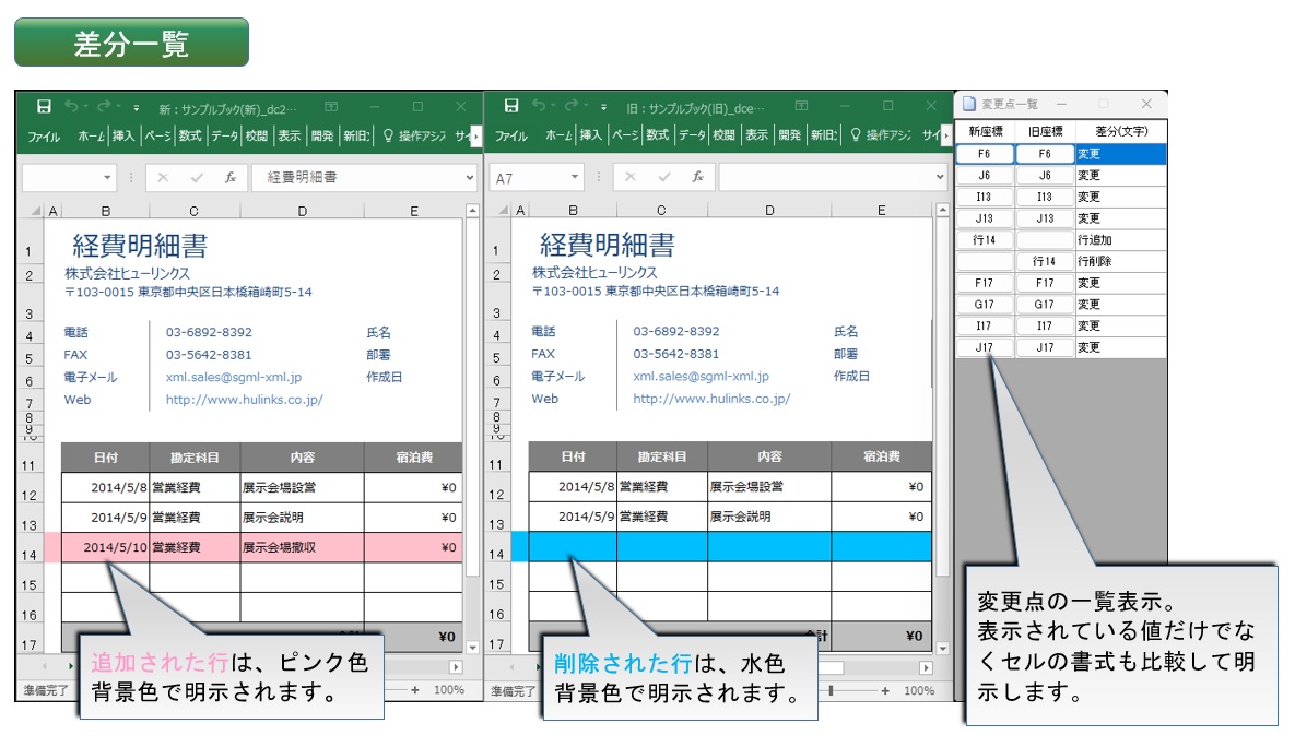 新旧の Excel を左右に並べ、追加・変更・削除を、文字色や背景色で分かりやすく表示します。