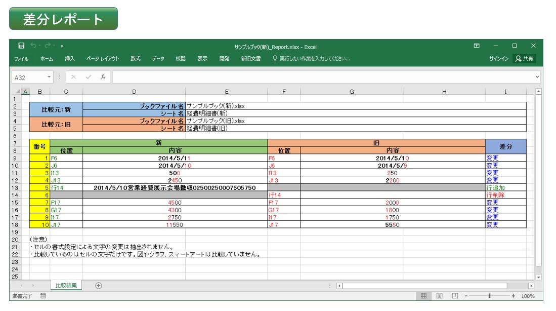 Excel 文書の比較結果が一目でわかり、差分、更新漏れが一目でわかる