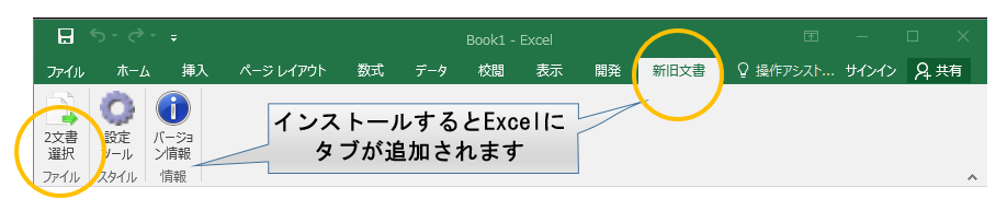 - インストールすると Excel に「新旧文書比較」タブが追加されます。