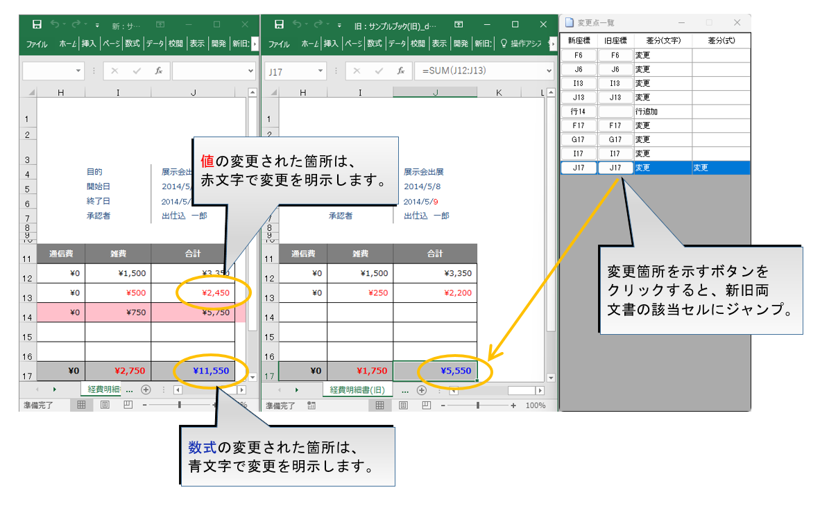 - 新旧2文書を比較、大きなワークシートでも変更箇所をすぐに把握
