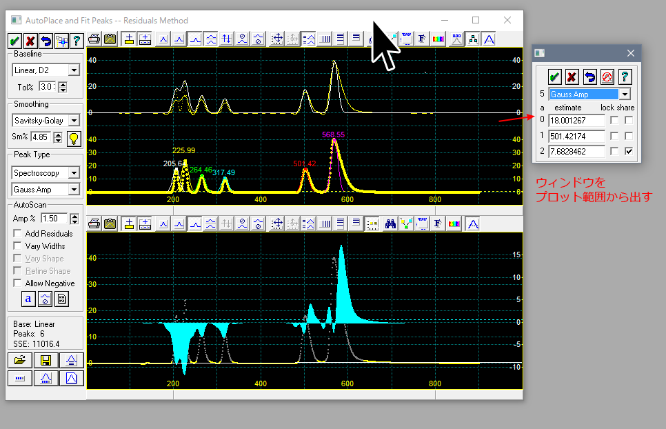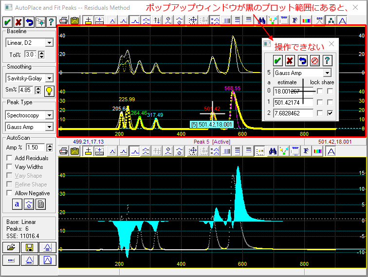 PeakFit では、プロット上のピークのいずれかをマウスで右クリックすると、そのピークの属性を編集できるポップアップメニューが表示されますが、このウィンドウがプロット範囲内にあると、カーソルが十字のまま引き継がれてボタンの操作や値の入力ができなくなります。