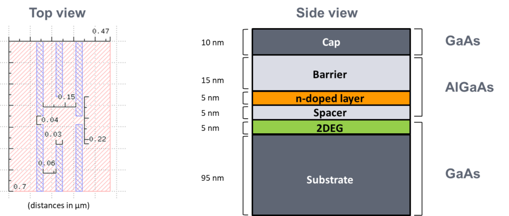 側面図はチップウェハーの成長 (\(z\)) 軸 に沿ったヘテロ構造の積層を表しています。AlGaAs の伝導帯端エネルギーが GaAs よりも高いので、AlGaAs 層は基板と上部ゲートの伝導を妨げるポテンシャル障壁として作用します。加えて、AlGaAs 層へのドープはバンド曲がりの原因になり、三角形の閉じ込めポテンシャル井戸が GaAs 基板と AlGaAs の界面で形成されます。これは、上図で “2DEG” とラベルされた領域で発生します。