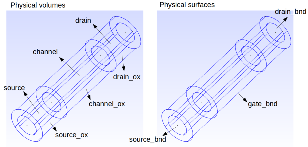 Gmsh を用いることで、任意の 1D, 2D, 3D デバイス構造を定義し、メッシュを作成することができます。加えて、Gmsh を用いることで、物理的なボリューム、表面、曲線、点に至るまで領域と境界にラベル付けできます。ナノワイヤーの例(例1)では、以下のようなラベル付けをしました。