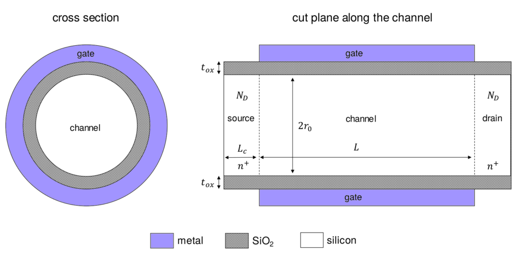 ナノワイヤーは2つの同心円状の円柱でモデル化されており、\(z\) 軸に沿った共通の回転対称軸を持っています。内部の円柱はシリコンで満たされており、内部と外部の円柱に挟まれた領域によって形成されるシェルは二酸化ケイ素で満たされています。シリコンの円柱の2つの終端(ソースとドレイン)はpドープされており、中心のシリコン領域(チャネル)はドープされていません。金属ゲートはチャネルを囲んでおり、ソースおよびドレイン領域の外面はオーミック接触で平衡に保たれています。