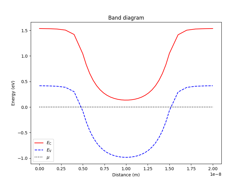 ここで、ポアソンソルバーのパラメータを設定するのに使用する SolverParams オブジェクトを定義します。また、自己無撞着ソルバーの公差(引数 tol)を \(10^{-3}\textrm{ V}\) に、反復の最大回数(引数 maxiter)を \(100\) に設定します。これは、自己無撞着の繰り返しは2つの成功した反復の静電ポテンシャルの最大差が \(1\textrm{ mV}\) よりも小さいときに終了することを意味し、反復の最大回数に達した場合は、警告メッセージと共に強制的に停止します。Solver クラスを定義しているそれぞれのモジュールが関連する SolverParams クラスを持っていることに注意してください。ここでは、明らかなように poisson モジュールの SolverParams クラスを使用しています。