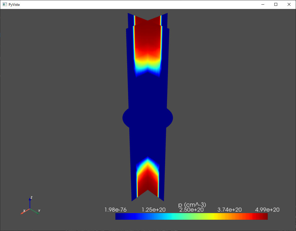 ひとたびメッシュを生成して .msh 形式で保存すれば、Python API で QTCAD に読み込むことができます。さらに、デバイスオブジェクト(マテリアル、ドープ密度、境界条件等)を指定し、関連するソルバーをインスタンス化、実行します。