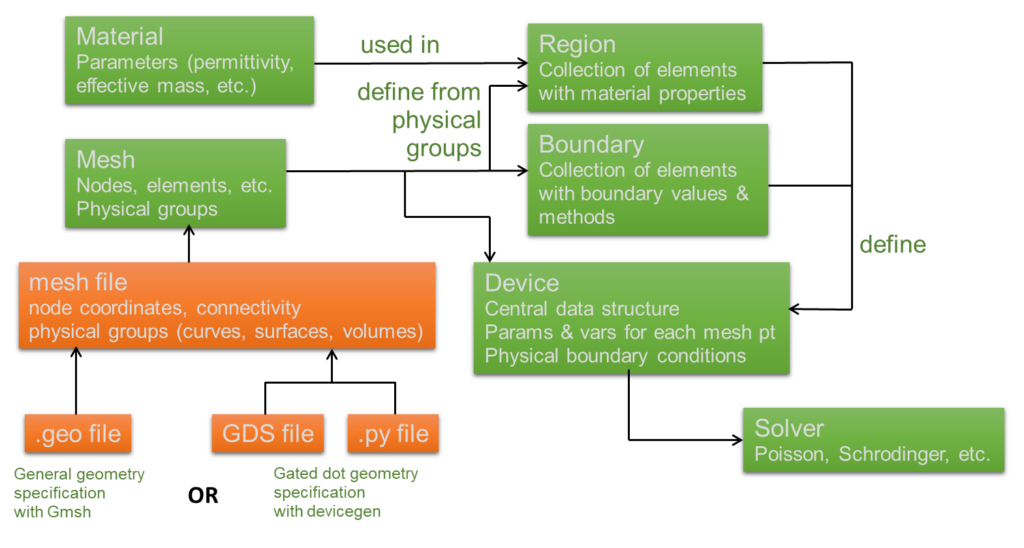 オレンジの四角はNanoacademic 製品ではない外部の機能で、緑の四角は内部のモジュールやクラスを示しています。また、これらの緑の四角は有限要素シミュレーション用の Python API をサポートしています。