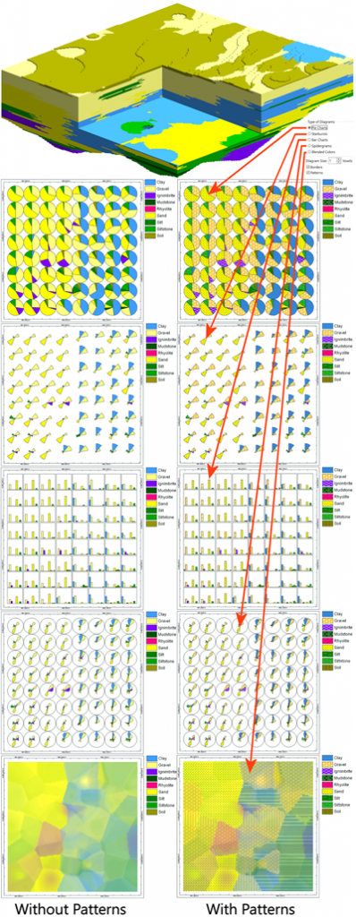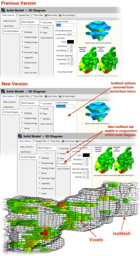 - RockWorks の多くのプログラムで使用されるソリッド表示オプションの設計を見直して、IsoMeshes を Voxels ダイアグラムと組み合わせてプロットできるようになりました。従来のバージョンでは、IsoMeshes の組み合わせは IsoSurfaces のみに限定されていました。