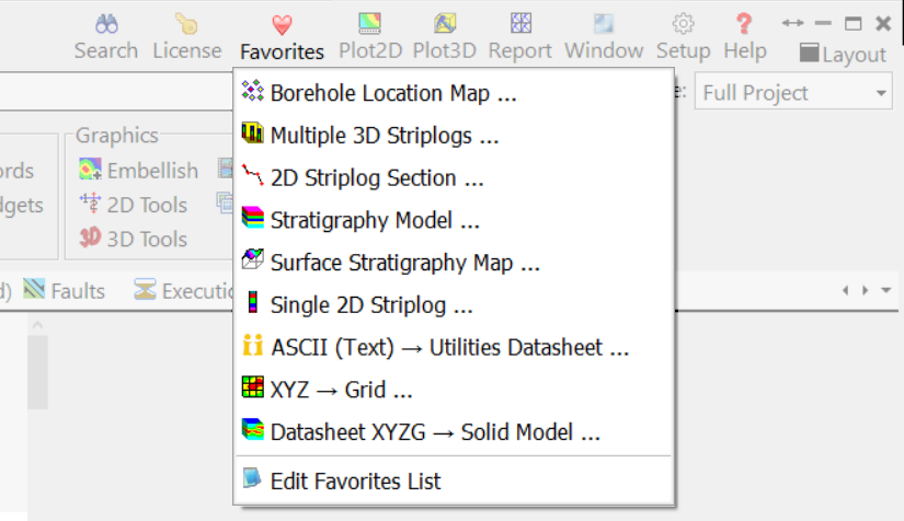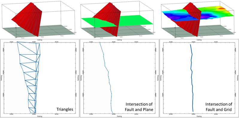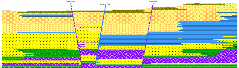 Fault (断層) は、新たに追加されたメインメニューのタブからアクセスできるデータベーステーブルを使って管理するようになりました。これらの断層は、2D マップまたは 3D サーフェスとしてプロット可能です。全てのモデリング (グリッドやソリッドモデリング) と、これらのモデルに基づいて作成されるダイアグラムは、この 3D 断層を制約条件とすることができます。利用可能な断層数は、Basic (3 faults), Standard (3 faults), Advanced (無制限) となります。