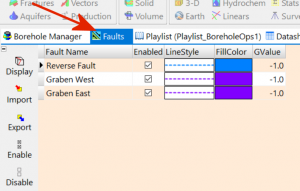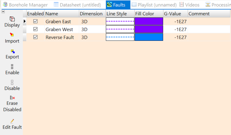 プログラムのメインウィンドウにある Faults タブを使用して、単一のデータベーステーブルで 2D および 3D の断層を管理できます。