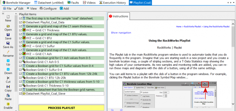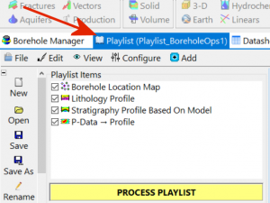RockWorks の Playlist 機能を使えば、オートメーション (作業の自動化) を容易におこなうことができます。ボタンをクリックするだけで、現在の Playlist にプログラムを追加できます。