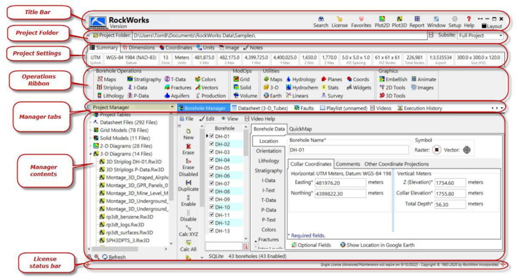 RockWorks は、ボーリング孔とデータシートのデータを管理するプログラムです。ベースマップ、等高線マップ、クロスセクション (断面図)、3D サーフェス、3D ソリッドブロックモデル、フェンスダイアグラムの作成に利用できます。メイン画面は以下の部分で構成されています。