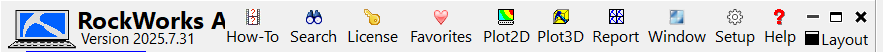 - プログラムのバージョン (YYYY.MM.DD 形式) が記載されています。そのほかに、検索、ライセンス管理、お気に入りメニュー、RockPlot2D、RockPlot3D、ReportWorks、ウィンドウ スイッチャー、セットアップ メニュー、ヘルプ、マルチスクリーン、最大化、最小化、単一画面の最大化/復元、終了、レイアウト ツールなどの「良く使う」ツールが用意されています。