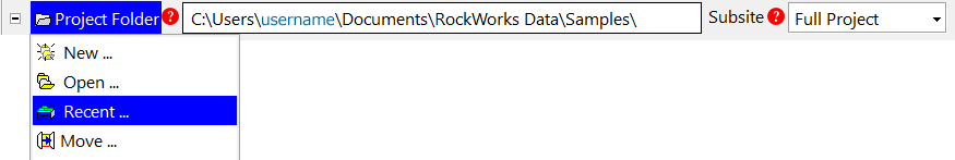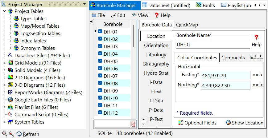 - 各種テーブルと RockWorks ファイルのリストを含む Project Manager タブ、ボーリング孔データの入力と表示を行う Borehole Manager タブ、データシートにデータを入力して表示を行う Datasheet タブ、断層データをインポートして表示する Faults タブ、複数の操作を自動化する Playlist タブが用意されています。説明ビデオを表示する Videos タブ、プログラムの操作ログを表示する Execution History タブもここあります。