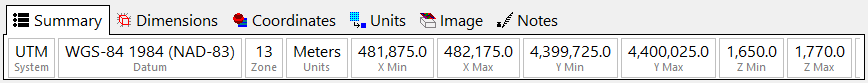 - 座標系の概要 (Summary) が表示されます。プロジェクトで使用する XYZ 座標の寸法や範囲 (Dimensions)、座標系 (Coordinates) の指定、寸法の単位 (Units) の変更やスキャン、背景画像の追加 (Image)、メモを追加するためのツール (Notes) が用意されています。