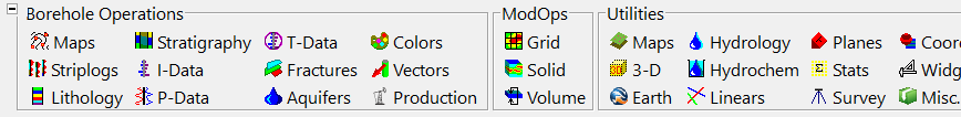 - 各種マップ、モデル、断面図を作成するための Borehole Operations、データシートからモデルを作成するための ModOps、Datasheet のデータから地図やプロットを作成するための Utilities、画像を装飾および変更するための Graphics で構成されています。