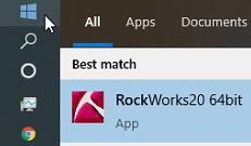 - デスクトップ上の RockWorks ショートカットをクリックして RockWorks を起動します。Windows のスタートボタンから「RockWorks」と入力して RockWorks を起動することもできます。