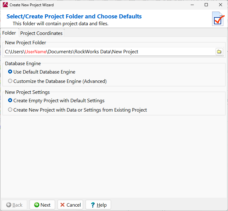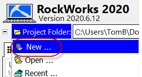 プロジェクトフォルダのデフォルトのパス(C:\Users\<username>\Documents\RockWorks Data\New Project\)をそのまま使用するか、右側の黄色のフォルダアイコン