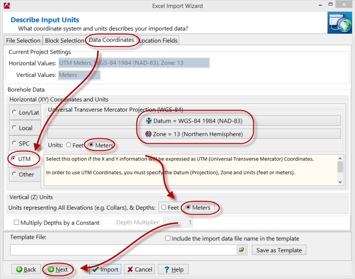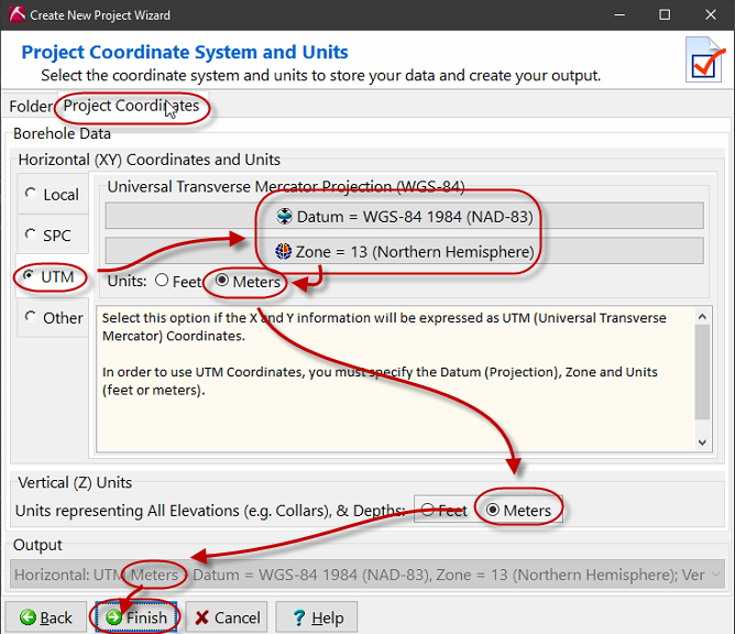 - Horizontal (XY) Coordinates and Units セクションで、座標系が UTM に設定されていることを確認します。