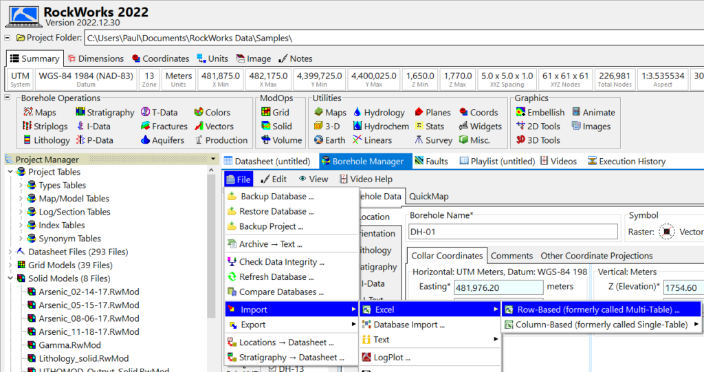 - RockWorks で、File | Import | Excel | Row-Based (formerly called Multi-Table) を選択します。