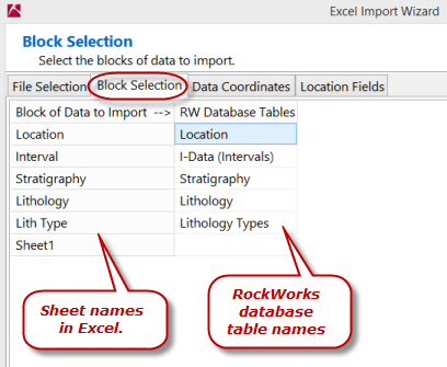 Block Selection タブでは、左列に Excel のシート名、右列に対象となる RockWorks データベースのテーブル名が表示されます。このファイルでは名前は自動的に対応付けられますが、RW Database Tables 列のテーブル名または空白セルをクリックすると、すべてのテーブル名のドロップダウンリストが表示されます。お使いのプロジェクトにデータを入力する際には、対応するテーブルを指定する必要がある場合があります。